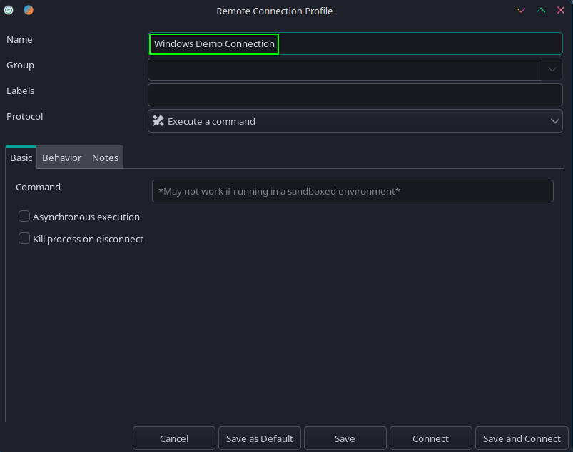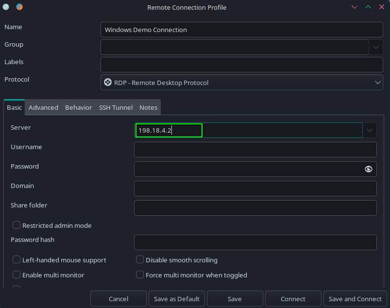 Namefield, enter in what you would like to name the connection to your windows instance.