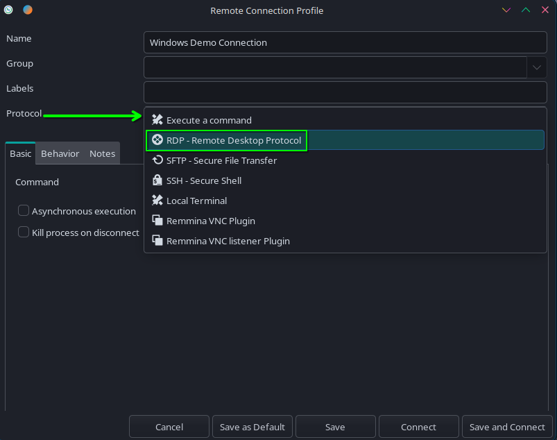 Protocoldropdown and selectRDP - Remote Desktop Protocolas your protocol.