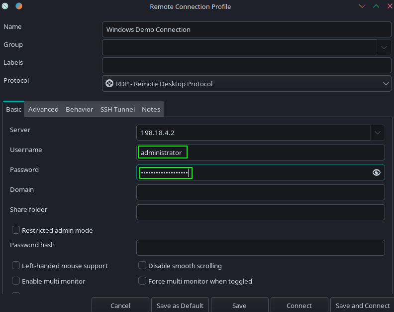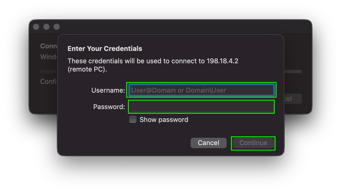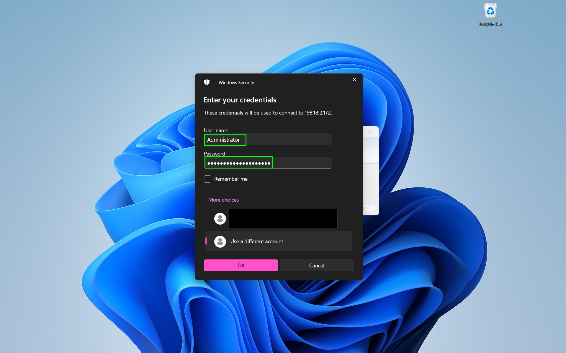 User namefield, enter "Administrator", and in thePasswordfield, enter in the password you set when first logging in to your Windows instance, then selectOK.