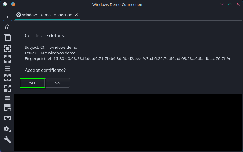 - When prompted to accept the server's certificate, select