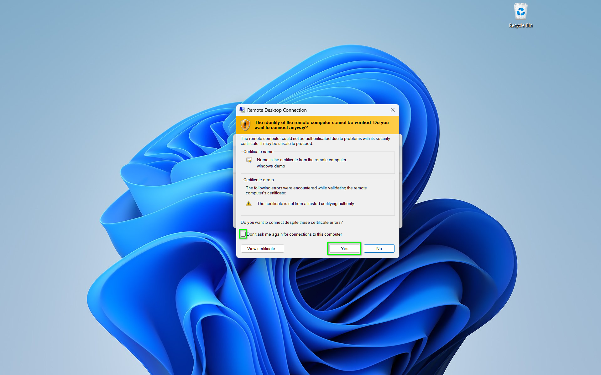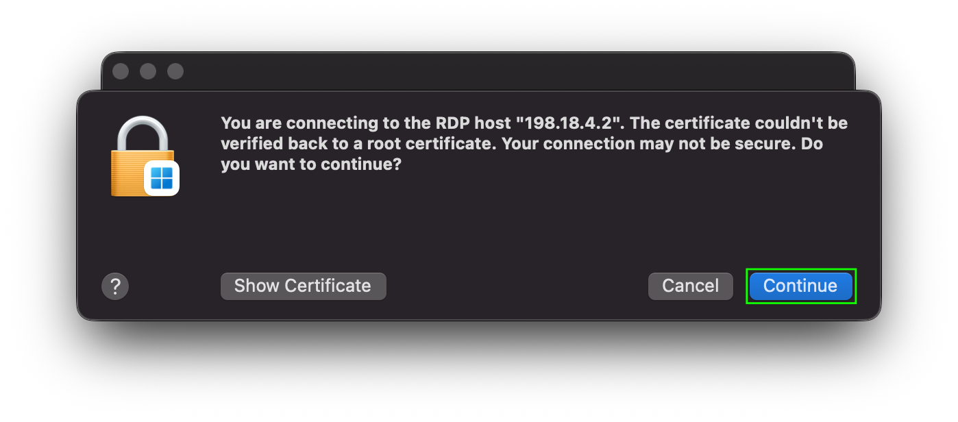 - If you recieve a warning from windows stating that "The identity of the remote computer cannot be verified", check the